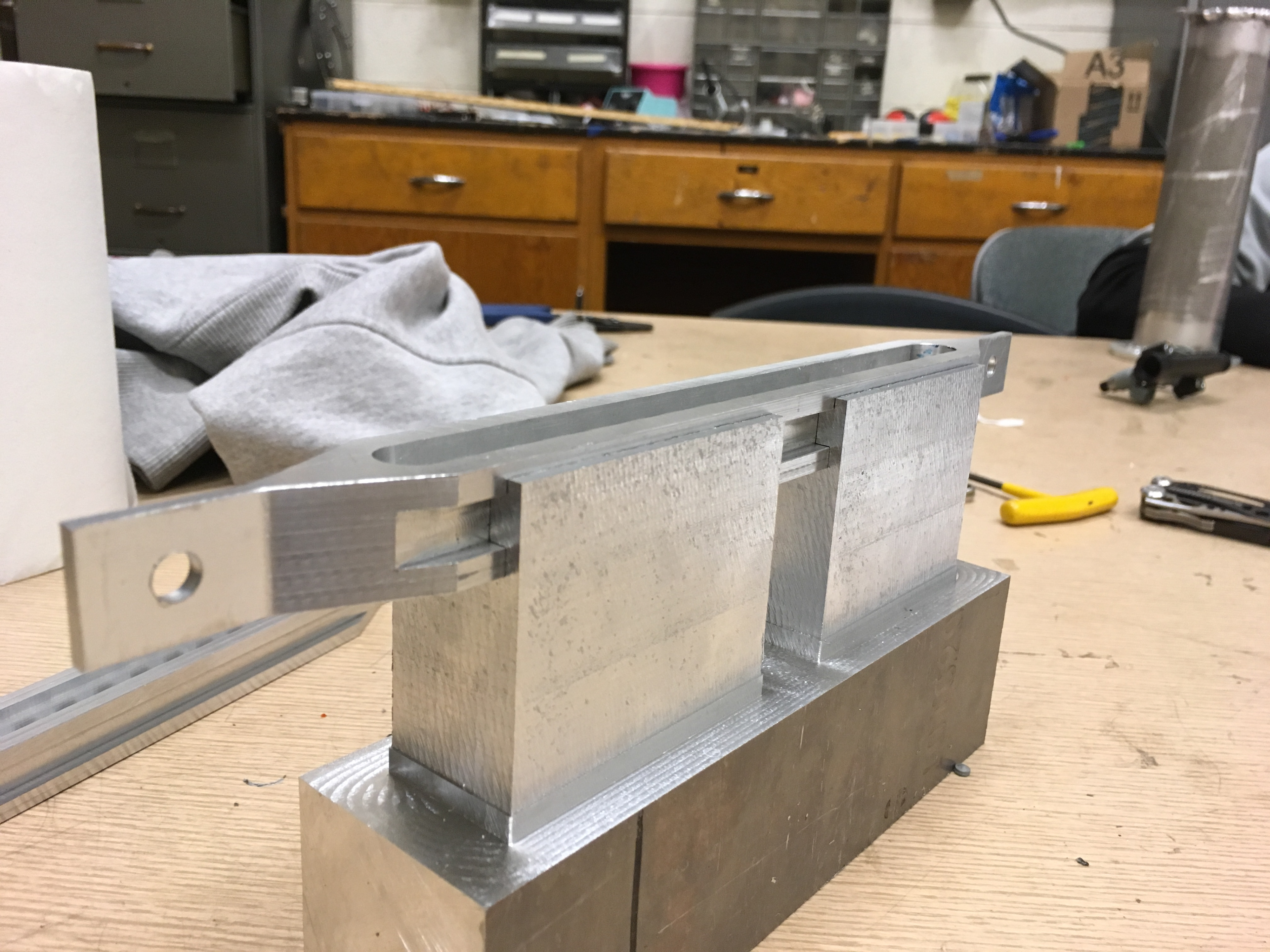 The manufacturing process was more intensive than in previous years, but well within our means. Blanks for the pedals were cut on a waterjet and post-machined to hit the tight tolerances around the bearing pockets. The pedal carriers were CNC-machined to create the plan-view profile, then sent to the Bridgeport to machine the slots. The pedal carriers were fully CNC-machined in several operations. The slots on the carriers were machined using a key-slot cutter, and the pedal rails were checked for fitment in the machine to ensure assembly of all the components was possible.